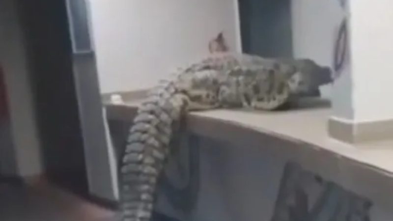 Footage circulating online shows the predator using its front legs to hoist itself onto a counter before briefly resting on top, with its tail still dragging across the floor. It later slipped down and was seen moving through the lounge area, further alarming those present.