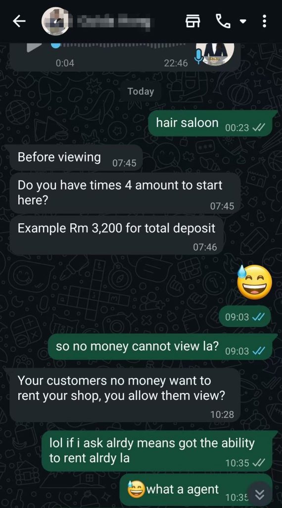 The exchange, which took place over a messaging app, involved a renter interested in leasing a shop for a hair salon business. Before arranging a viewing, the agent reportedly relayed the shop owner’s requirement that potential tenants must have funds equivalent to four times the monthly rental, amounting to a total deposit of RM3,200.