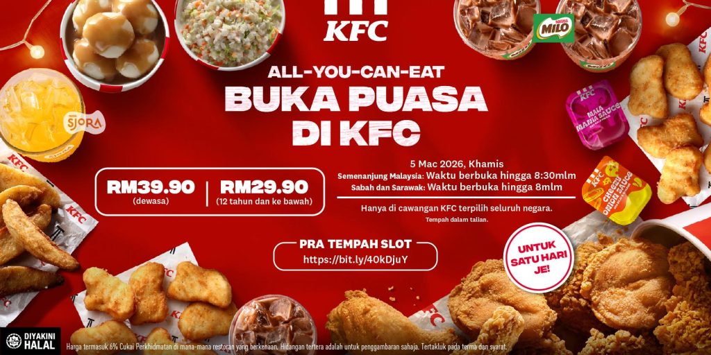The promotion, Buka Puasa Di KFC, will be held on 5 March 2026 at 32 KFC outlets nationwide. Adults can enjoy the buffet for RM39.90, while children aged 5 to 12 pay RM29.90. In Peninsular Malaysia, the event runs from iftar time until 8:30pm, while Sabah and Sarawak outlets will be open until 8:00pm.