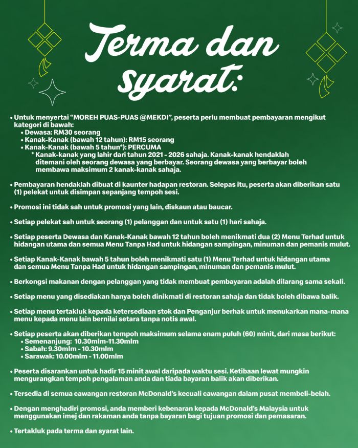 Families and friends are encouraged to reserve their spot early and head to participating McDonald’s outlets to enjoy the Moreh Puas-Puas @ Mekdi feast before the promotion ends on 15 March 2026.