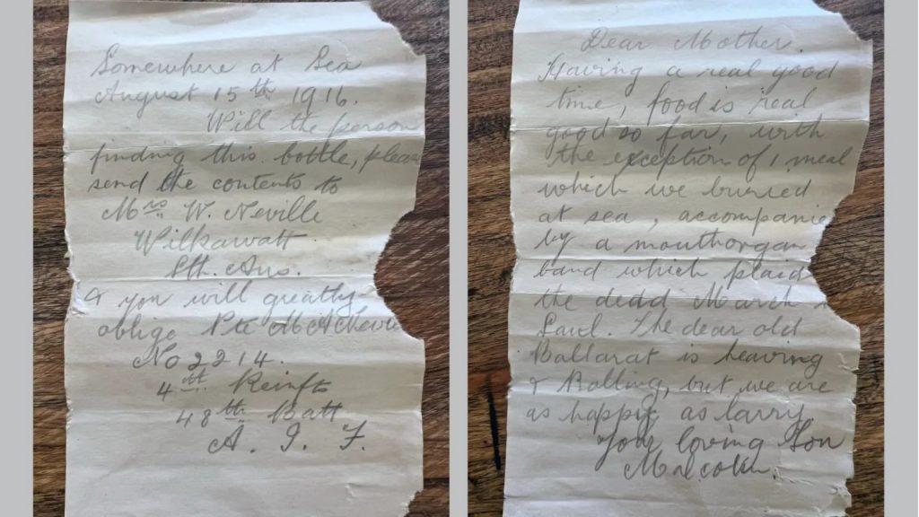 Two handwritten messages from Australian soldiers dating back to 1916 have been discovered inside a glass bottle on the country’s south-western coast — more than a century after they were written.