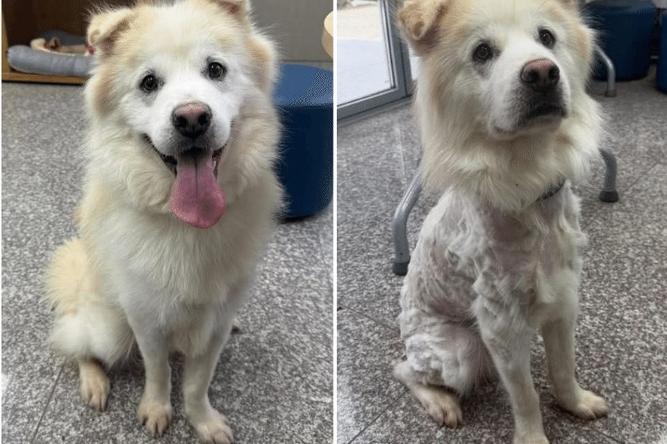 The shelter was stunned—not only by the swift return, but by Kuno’s physical state. Before-and-after photos shared by the shelter showed the once-fluffy pup now nearly bald, with only the fur on his head left untouched.