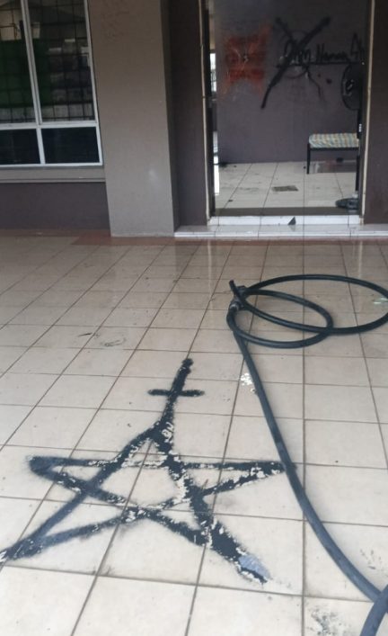 Photos provided by the department showed the burnt table positioned beside a larger table that appeared to have been converted into a makeshift altar. Several pentagrams were also found drawn on the floor and on a nearby wall, suggesting possible occult activity.