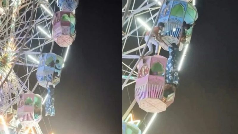A terrifying incident unfolded at an amusement park in Chhattisgarh, India, when a woman fell out of a Ferris wheel cabin, dangling precariously about 9 meters above the ground. Luckily, a man climbed up and rescued her, averting disaster.