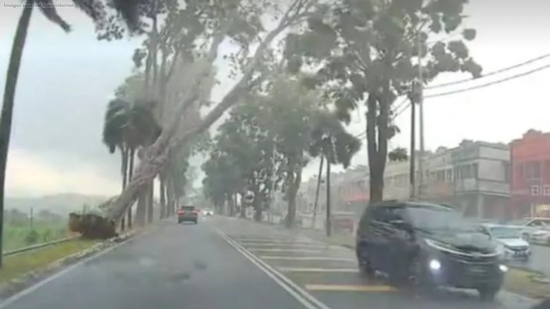 A motorist had a lucky escape after a large tree suddenly toppled across a road in Taman Bukit Galena amid heavy rain and strong winds.
