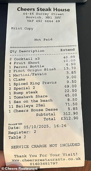 A group of four women racked up a lavish £312 (around RM1,700) meal at Cheers restaurant in Norwich before brazenly walking out without paying. The shocking dine-and-dash, which occurred on the evening of October 5, included steaks, cocktails, and 11 shots of Baileys, leaving restaurant owner Andrea Marinho forced to cover the bill from her own earnings.