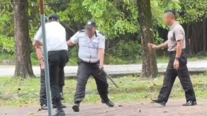 A video circulating online shows five security guards gathered in an open area, practicing what appears to be self-defense or combat training under the guidance of an instructor.