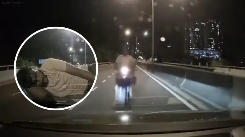 Instead of collapsing or reacting in pain, the motorcyclist was seen lying on the car bonnet in a ‘sleeping’ pose, tucking an arm near his head and briefly wiping his face as if checking for injuries.
