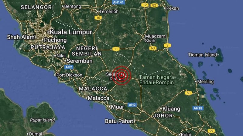 The earthquake occurred at coordinates 2.33°N and 102.79°E, registering a magnitude of 3.2. Its epicenter was located 18 km south of Segamat, Johor, at a depth of 10 km.