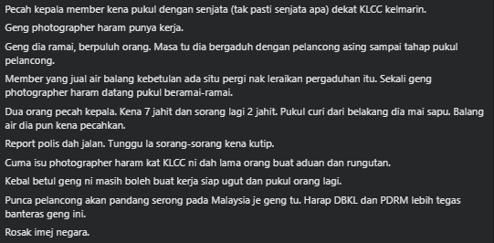 A formal police report has been lodged regarding the assault and the resulting property damage. This latest outbreak of violence has amplified long-standing complaints from the public about the persistent presence of unauthorised photographers at KLCC. Critics argue that the group’s “bulletproof” reputation and intimidating tactics have gone unchecked for too long, posing a threat to both locals and visitors.