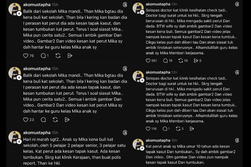 Malaysian actor Ako Mustapha has claimed that his son, Mika, was allegedly bullied at school in an incident that took place on Tuesday.