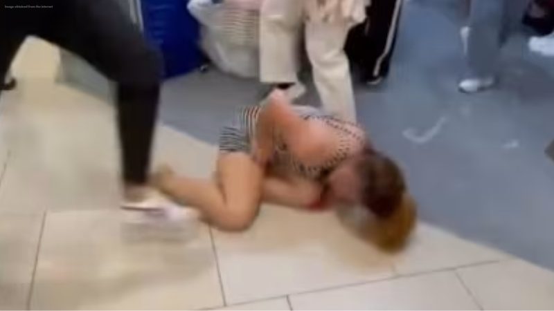 Footage circulating on social media shows the man kicking the woman in the back, causing her to fall, before he loses his balance and is restrained by bystanders amid screams and vulgarities.