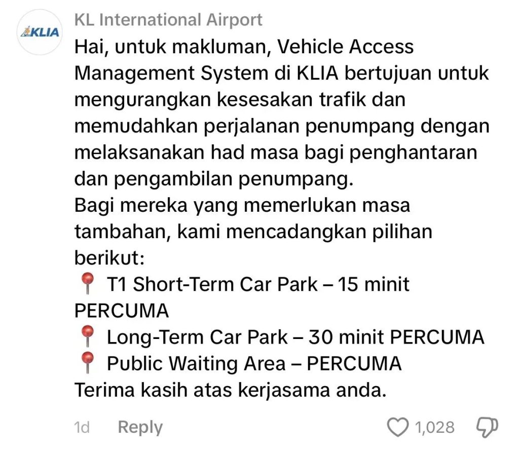 In response, KLIA clarified in the comments section that the area used was strictly designated as a drop-off zone, where vehicles are required to leave immediately after passengers alight.