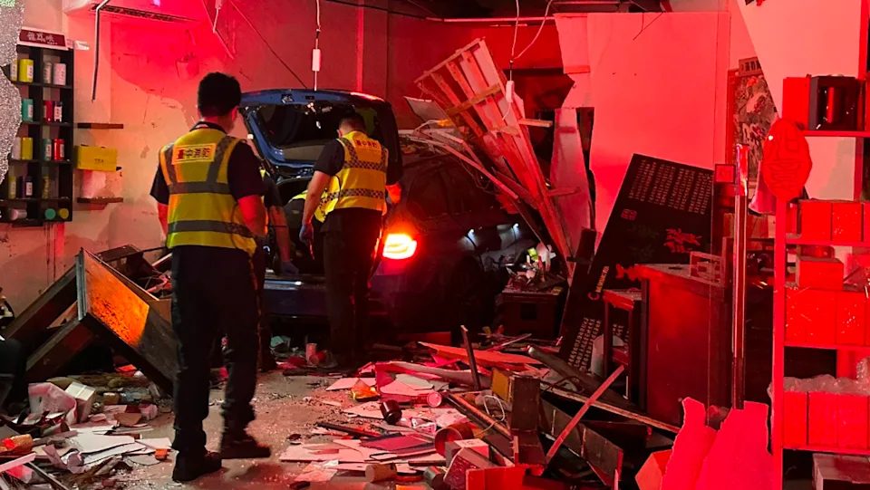 The crash happened around 3 a.m. when a blue sedan suddenly veered off the road and collided directly with the teahouse, crashing into the building with its front end severely crushed. The impact left the interior in disarray, with walls cracked and furniture scattered. Neighbors were reportedly awakened by the loud crash, prompting emergency calls. Firefighters arrived promptly to extricate the driver from the vehicle.