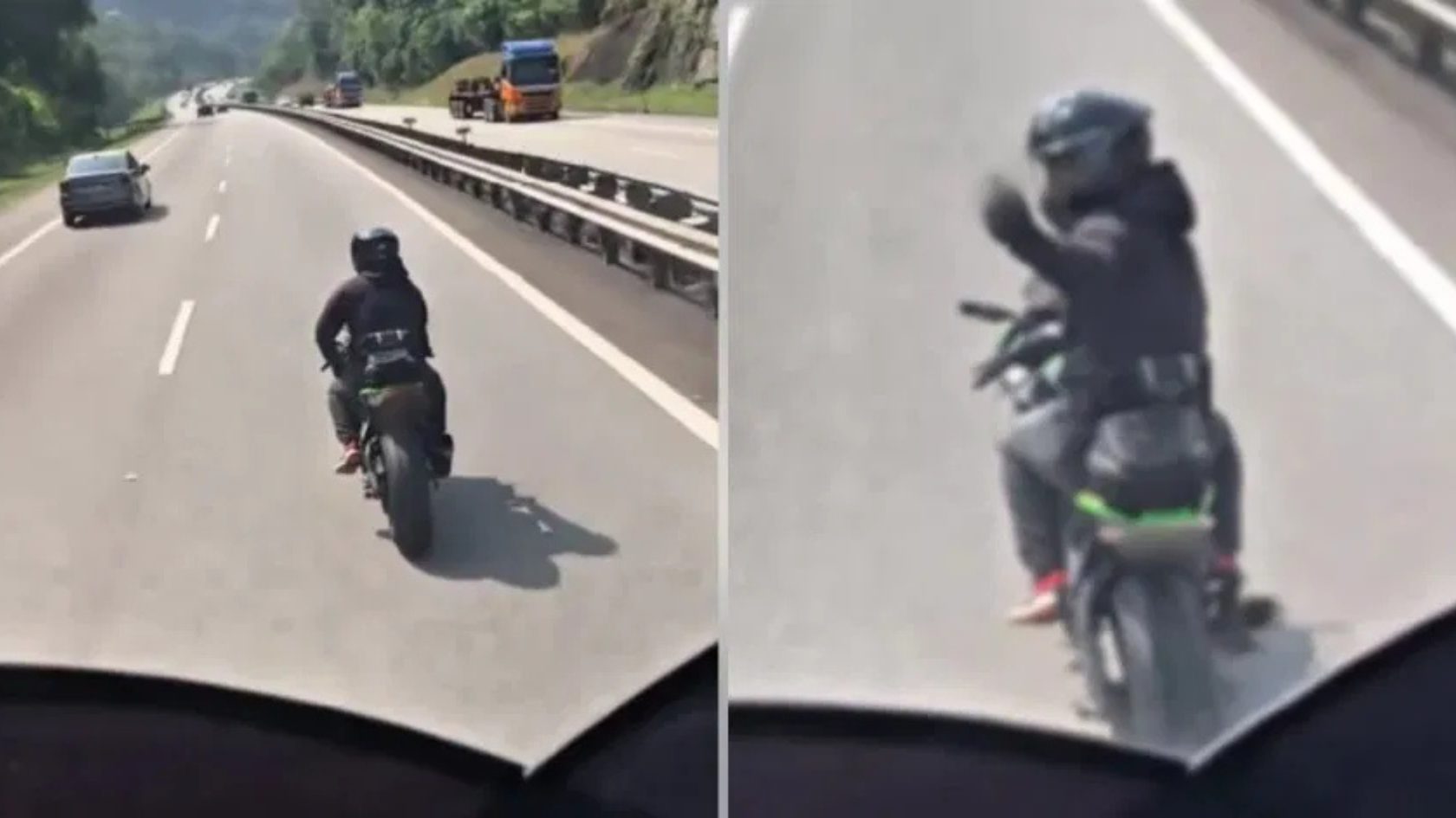 The footage further shows the motorcyclist deliberately maintaining a slow pace in the fast lane, causing the lorry driver to honk. In response, the rider grew more defiant—making more rude gestures and motioning for the lorry to move to the left lane, while continuing to block the path.