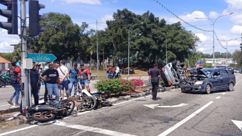 Two other motorcyclists, both 25, sustained injuries to their right legs. The driver of a Proton Saga, a 48-year-old woman, suffered forehead injuries and shoulder pain, while the driver of a BMW escaped unhurt. The Myvi driver, aged 35, sustained minor elbow abrasions.