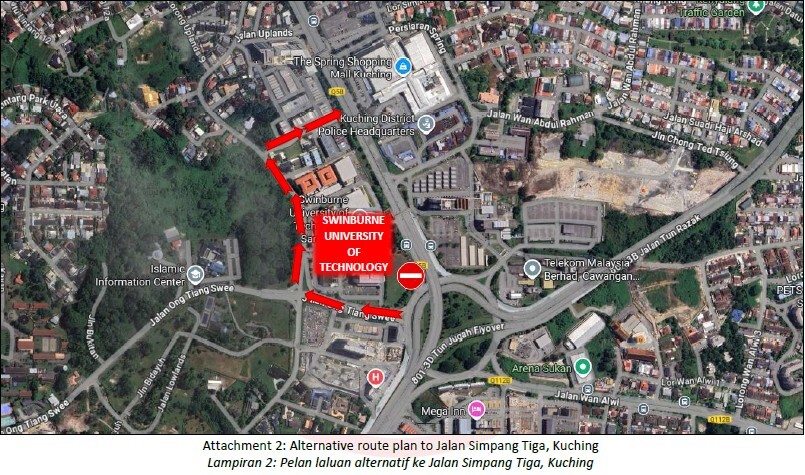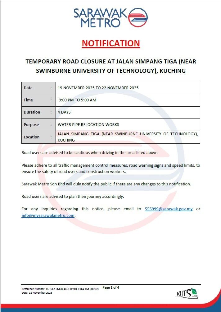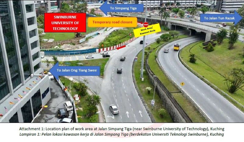 KUCHING – Motorists are advised that a section of Jalan Simpang Tiga, in front of Swinburne University of Technology Kuching, will be temporarily closed for four nights from 19 to 22 November to facilitate water pipe relocation works.