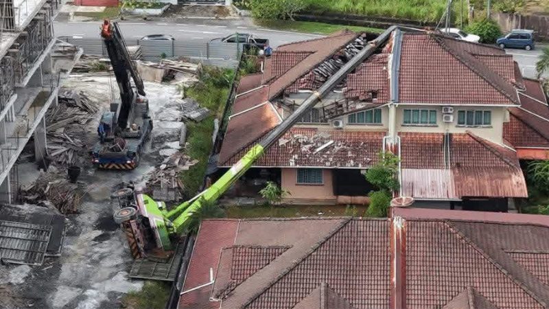 Two houses were damaged when a crane reportedly lost balance and toppled onto the properties in Taman Stutong Woodland earlier this morning.