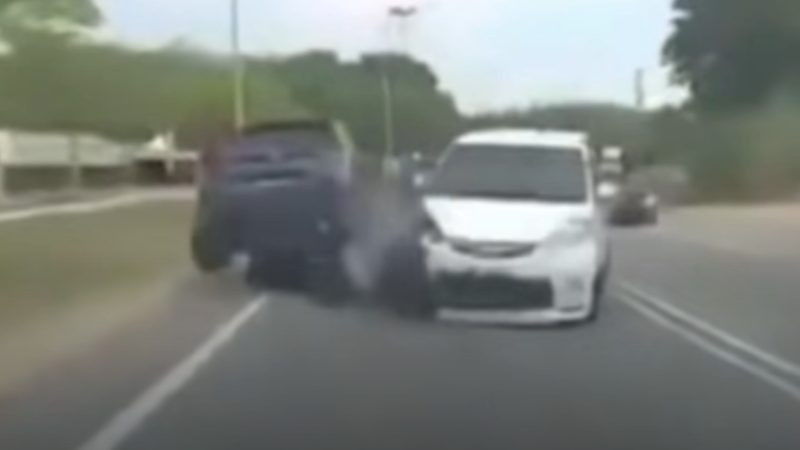The 16-second footage, believed to have been recorded in Malaysia and circulated via DashCam Malaysia, shows a white Perodua Alza travelling along a two-lane road before it abruptly loses control.