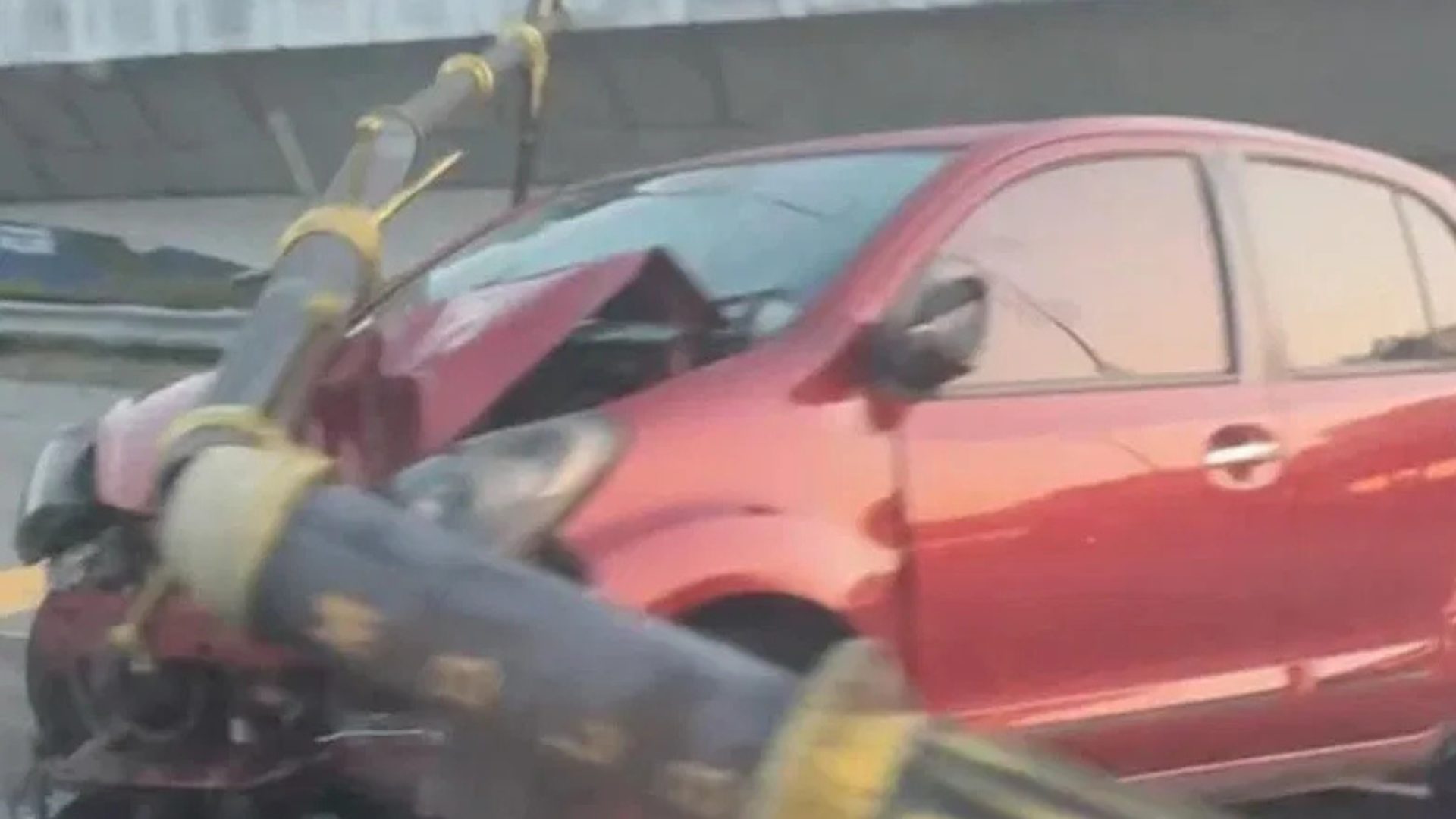 Photos and videos circulating online show the lamp post toppled across the road, blocking two lanes. The front of the woman’s Perodua Myvi was visibly crushed by the fallen pole.