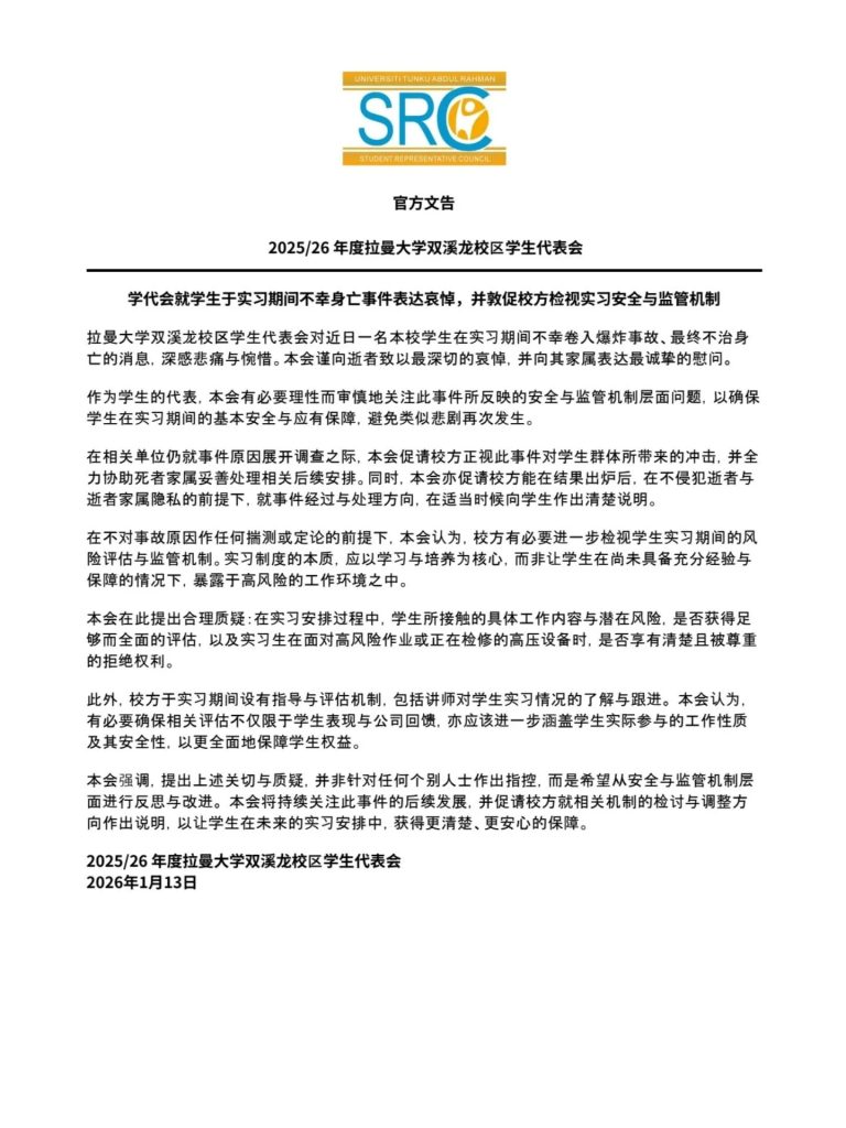 The student representative council of Tunku Abdul Rahman University of Management and Technology (TAR UMT) Sungai Long campus has issued a statement questioning whether the university had conducted a comprehensive risk assessment for internships, following a gas explosion that claimed the life of a student.