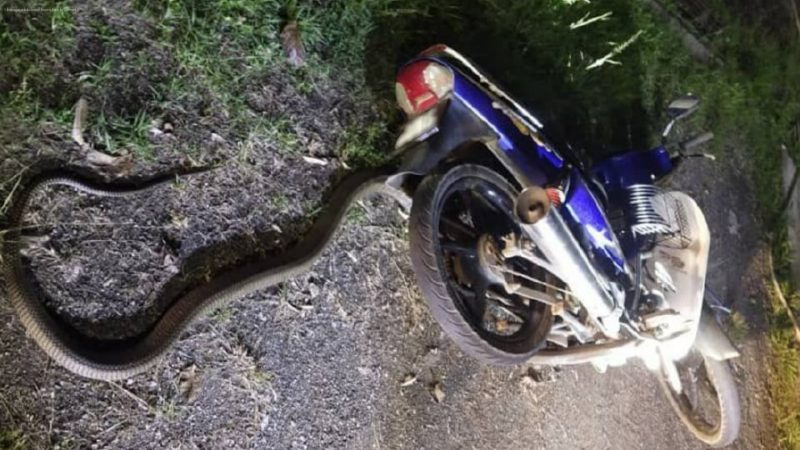 The 16-year-old rider, traveling on his motorcycle around 7:30 p.m., quickly braked and jumped off his bike to escape safely in the yard of his home in Kampung Banggol Sik Dalam. In a surprising twist, the four-meter-long cobra became lodged on the motorcycle’s brake, remaining stuck there.