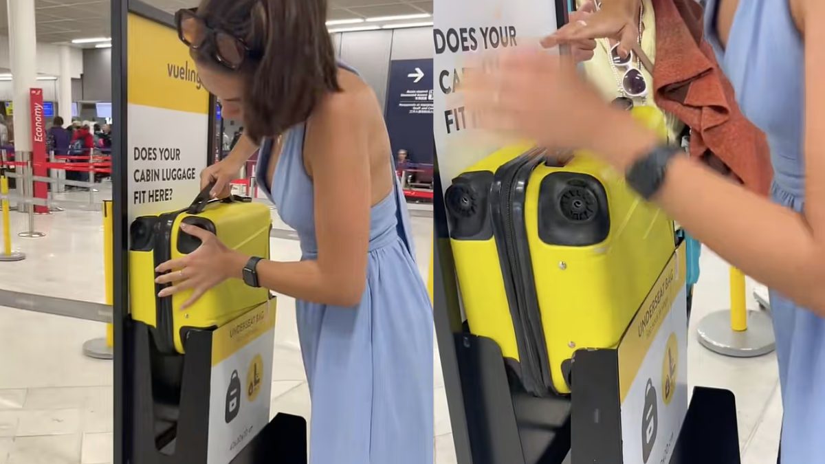 The event occurred on July 23 as Arina was preparing to fly from Paris to London with Spanish budget airline Vueling. Before boarding, she was asked to place her bright yellow suitcase into the baggage sizer to check if it met the strict carry-on limits (maximum 40×30×20 cm). Despite visible difficulty, Arina managed to push the suitcase into the sizer and pull it out again, leaving the ground staff visibly stunned.