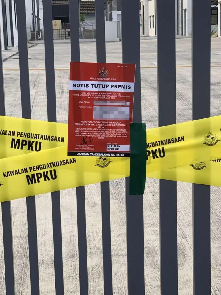 According to China Press, the Kulai Municipal Council (MPKu) arrived at the company and issued a shutdown order at 12:05am today, under Section 49(2) of the 2019 Kulai Municipal Council Licensing, Trade and Industry By-laws, pending further notice.