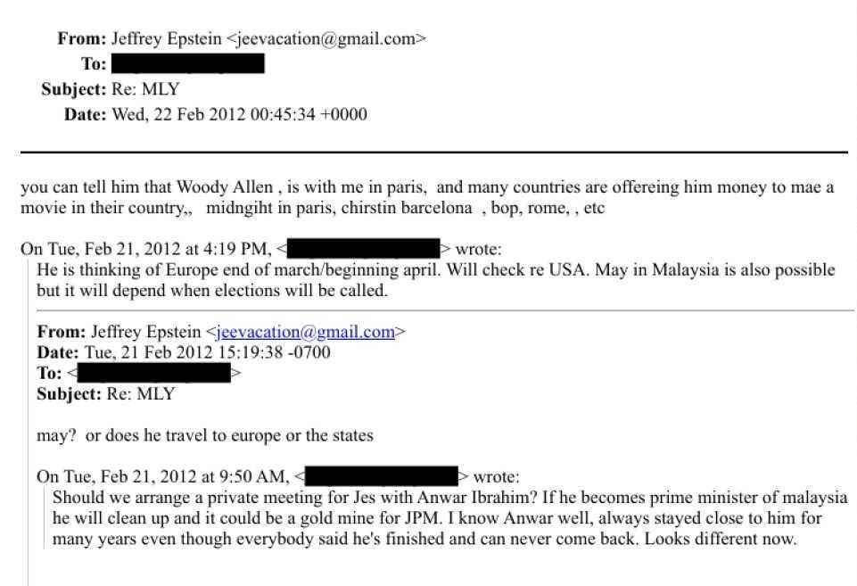 Epstein responded positively, inquiring whether Anwar would be available for a meeting in Europe or the US. The email chain suggested Anwar might be visiting Europe the following month or Malaysia in May, depending on the election schedule. Epstein also proposed meeting Anwar in Paris alongside filmmaker Woody Allen.