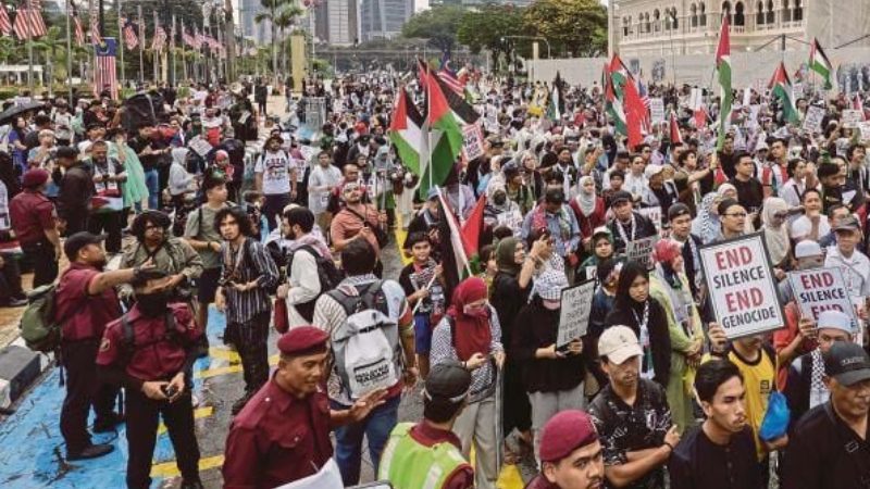 A check by Sinar Harian found that participants began assembling around the iconic square as early as 9:30 a.m., waving Palestinian flags and holding placards condemning acts of genocide.