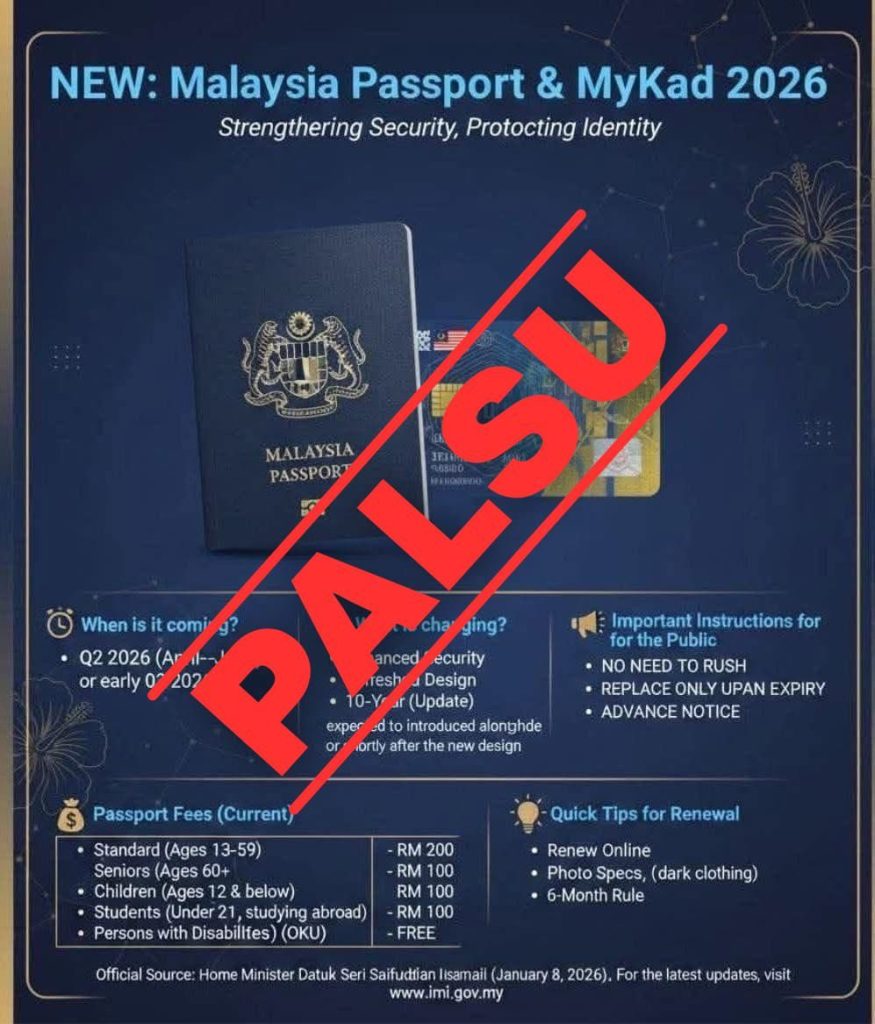 The Jabatan Imigresen Malaysia (JIM) has denied any involvement in the circulation of a poster titled “New: Malaysia Passport & MyKad 2026”, which has recently gone viral on social media platforms.