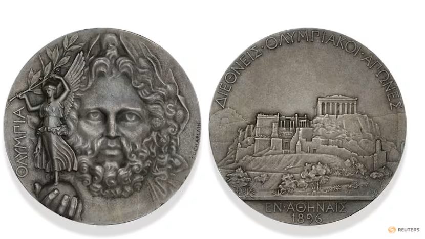 Designed by French artist Jules-Clement Chaplain, the medal depicts Zeus holding a globe topped with Nike, the Goddess of Victory, while brandishing an olive branch. The reverse features the Acropolis and Parthenon, along with a Greek inscription translating to “International Olympic Games – Athens 1896.”