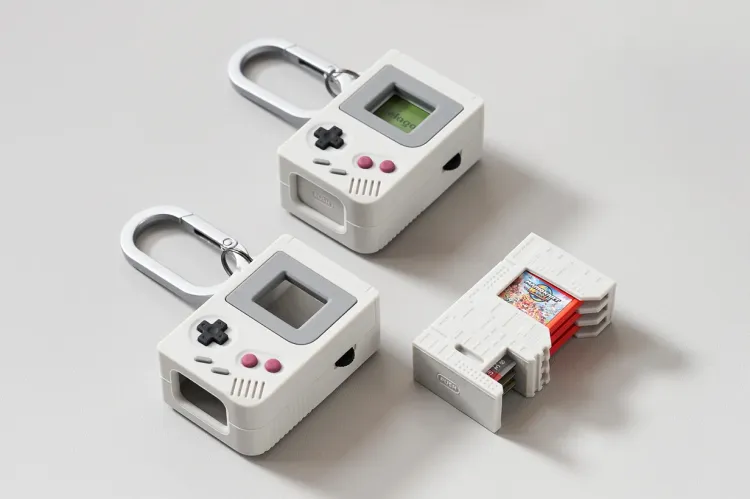 It slots neatly into a soft silicone casing designed to resemble the classic Game Boy, complete with a small display window for game artwork and an included carabiner for easy attachment to keys or bags.