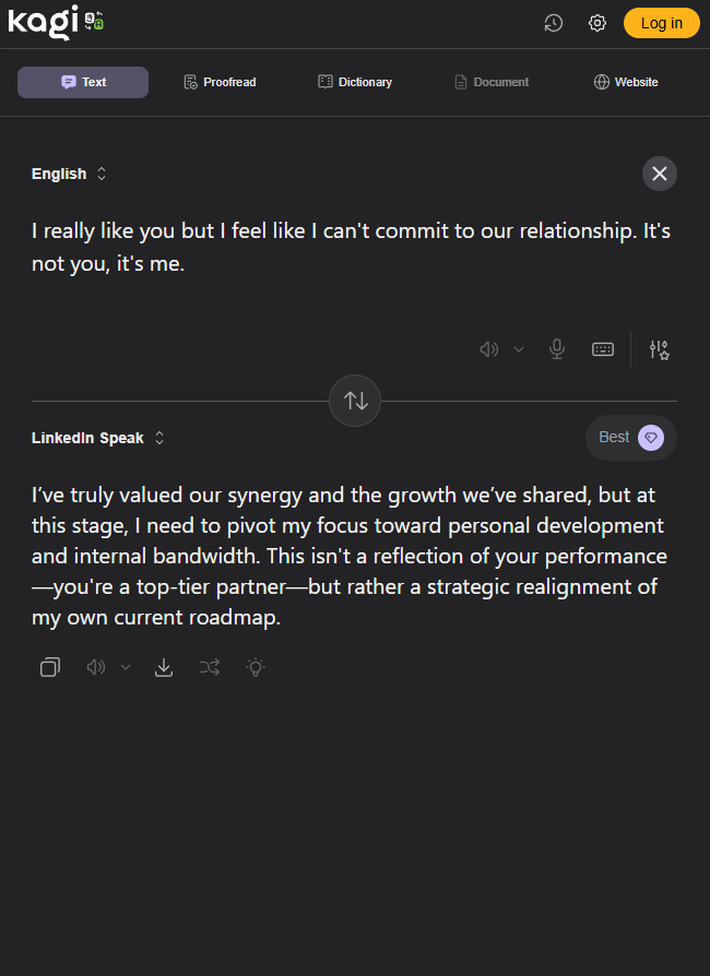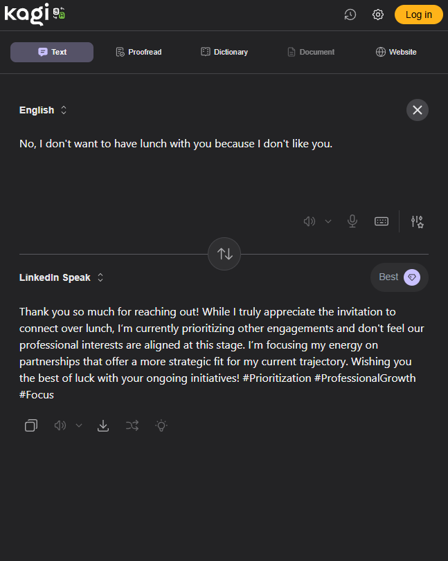 Try it for yourself here: https://translate.kagi.com/?from=en&to=linkedin